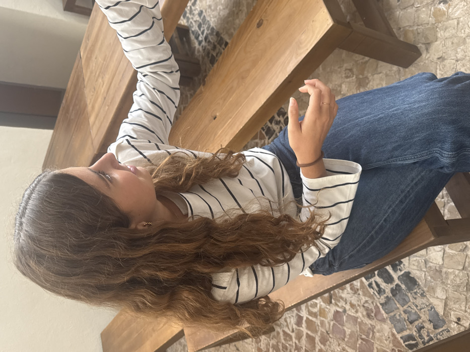 The image displays a young female subject seated in an indoor public or semi-public establishment in Oeiras, Portugal, likely a cafe, restaurant, or communal area. The subject is positioned in a three-quarter profile, looking towards the right side of the frame with a subtle smile. She has long, wavy, dark brown hair with reddish-brown highlights, parted centrally. She is wearing a white long-sleeved crew-neck shirt with thin black horizontal stripes and blue denim jeans. A small gold-colored twisted hoop earring is visible on her left ear. Her left wrist features a thin, dark brown bracelet, and a thin gold-colored band ring is on her left ring finger. Her right arm is extended upwards and out of the frame to the right, suggesting she is holding an unseen object, possibly a mobile phone for a photograph. Her left hand rests on her lap. She is seated on a light brown wooden bench. Behind her and extending to the right are more similar wooden benches and a long, rectangular wooden table. The floor is covered with an irregular mosaic of light beige, gray, and dark-colored stone tiles. The background wall is plain and light-colored. The scene is illuminated by ambient light.