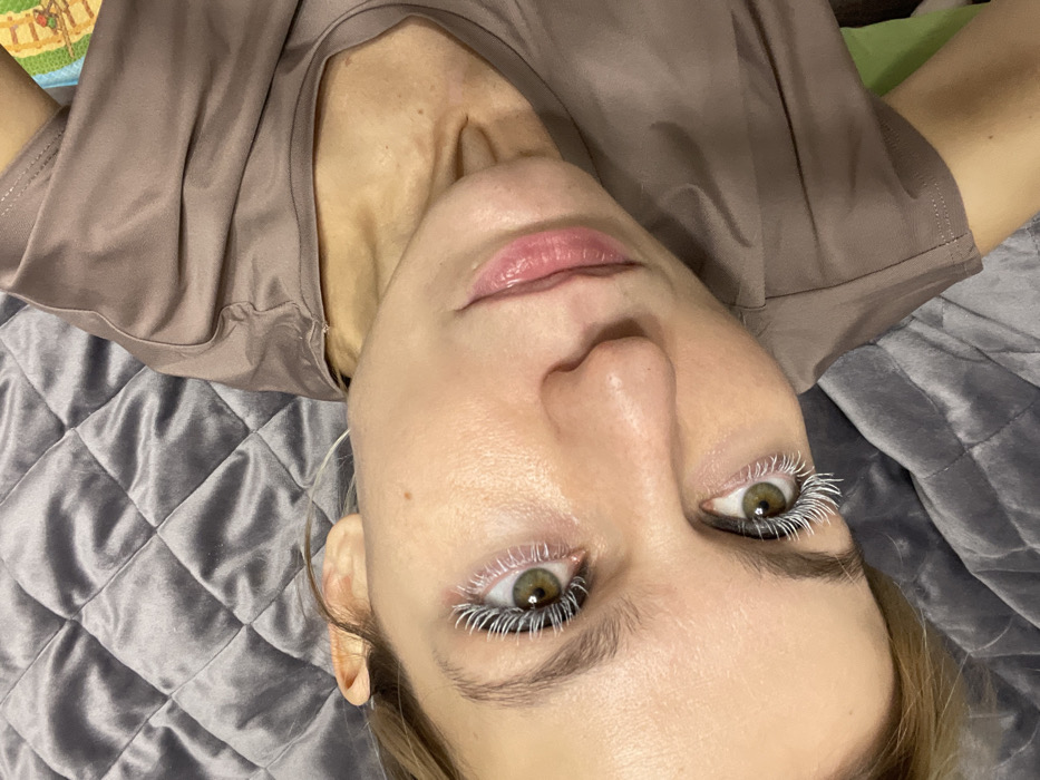 An overhead, slightly angled close-up photograph depicts an adult female lying supine on a grey, quilted fabric surface. Her head is tilted to the right, and her gaze is directed towards the camera. Her eyes feature green-hazel irises, with both upper and lower eyelashes heavily coated in a distinct white mascara, creating a spiky, elongated effect. Her lips are naturally pink and slightly parted. A small mole is visible on her right cheek. She wears a plain, light brown short-sleeved top made of a soft, smooth fabric. To the lower right of her body, a colorful children's playmat with a green background and cartoon-like elements is partially visible. The scene is consistent with an indoor, domestic environment. The specific location in the city of Moscow, Russia, cannot be determined from the visual information provided within the image.