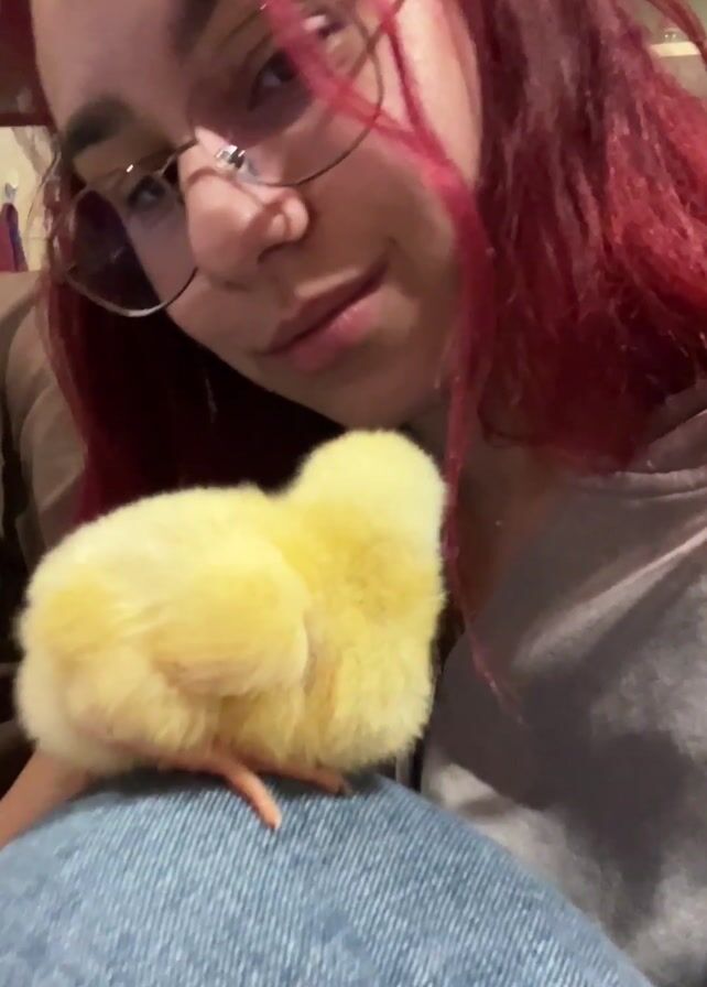 A woman with red hair and glasses is holding a small, fluffy yellow chick on her lap