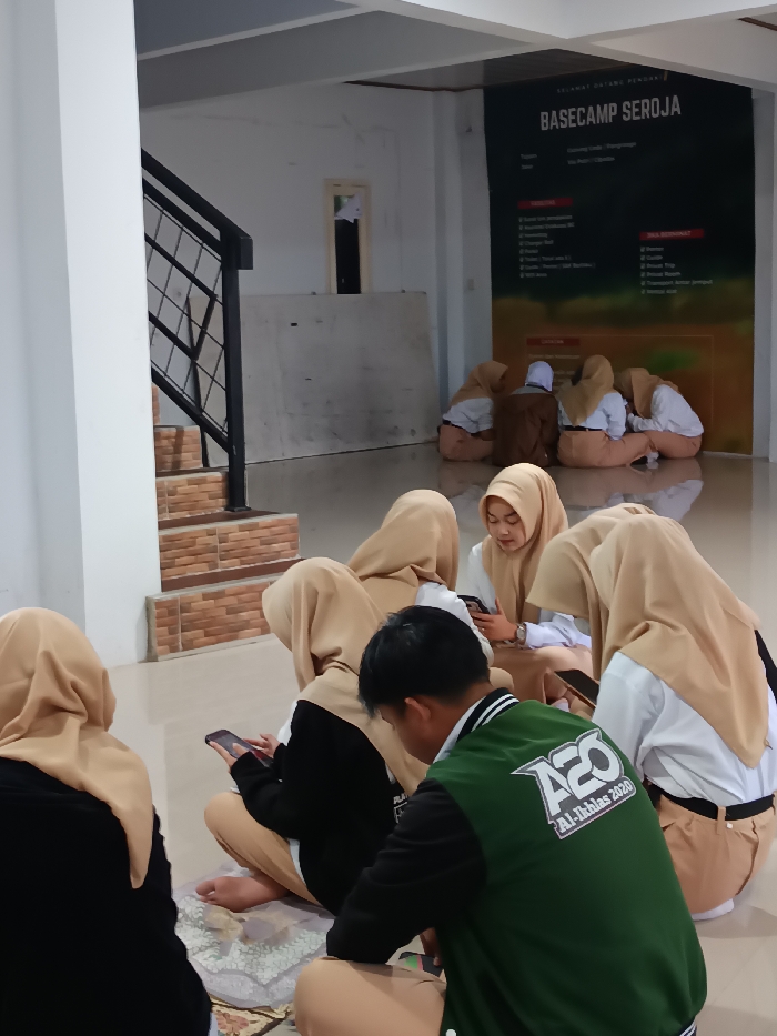 A group of individuals, mostly women wearing tan-colored hijabs, are seated on the floor in a room with white walls. Some are using their phones. A man in a green and black jacket with the text "A20 Al-Ikhlas 2020" is also present. Stairs with a black railing are visible to the left. A large sign reading "BASECAMP SEROJA" is on the wall in the background. The room is well-lit and appears to be an indoor space.