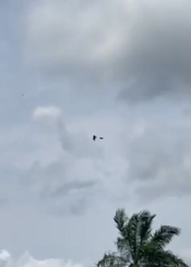 Two dark-colored birds fly in the sky, against a backdrop of puffy white and gray clouds. A palm tree is visible in the foreground, and a hilly landscape with sparse vegetation stretches out in the distance. The sky appears overcast.