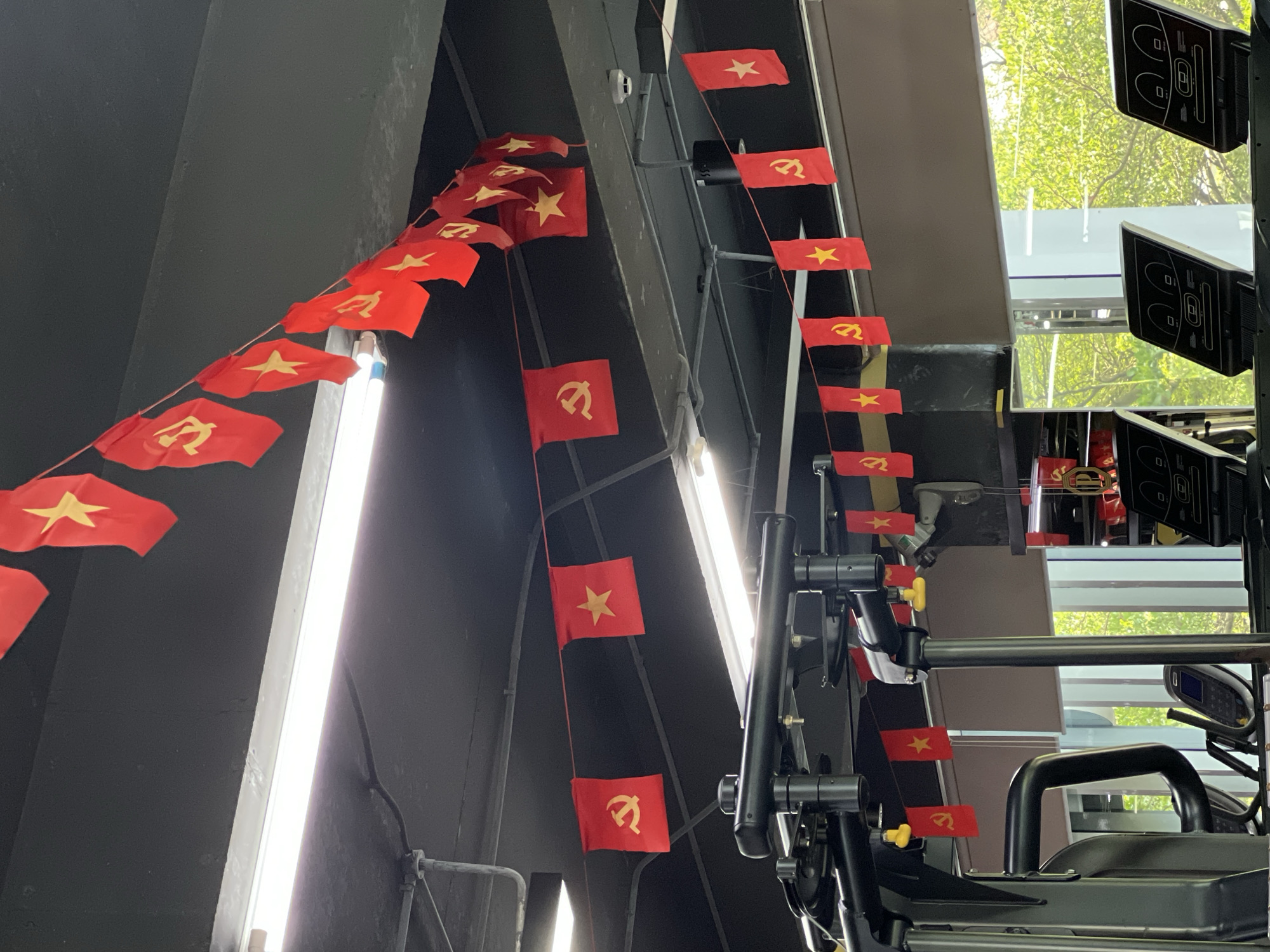 Red flags with gold symbols adorn the scene. Some display a single five-pointed star, while others feature a hammer and sickle. These are strung along a dark, possibly industrial or construction-like structure with bright fluorescent lighting. In the background, foliage is visible through a window. Parts of a gym workout machine are also in view.