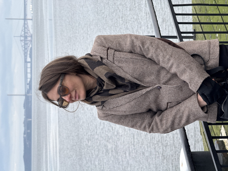 An adult female stands outdoors in the city of Blackness, Scotland, United Kingdom, facing right with a slight smile