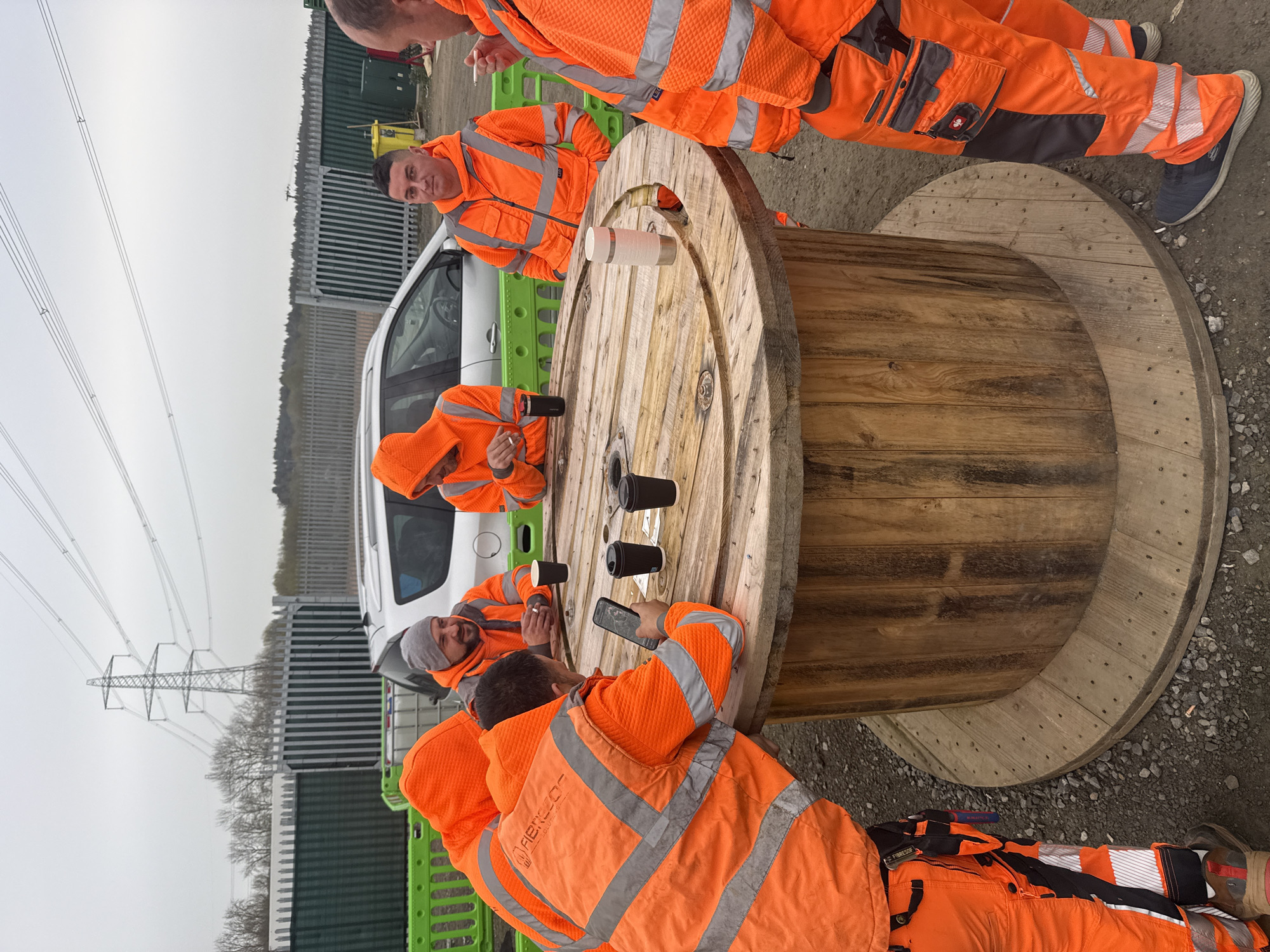 A group of approximately five construction workers in orange high-visibility workwear are gathered around a large wooden cable reel outdoors in Mid Suffolk, United Kingdom. The reel is being used as a makeshift table with several black paper coffee cups and a clear plastic container on its surface. One worker is standing with one leg on the reel base. Another worker is seated next to a white car. One worker is smoking a cigarette. Another is holding a smartphone. In the background, there are metal barriers, power lines, trees, and an overcast sky.