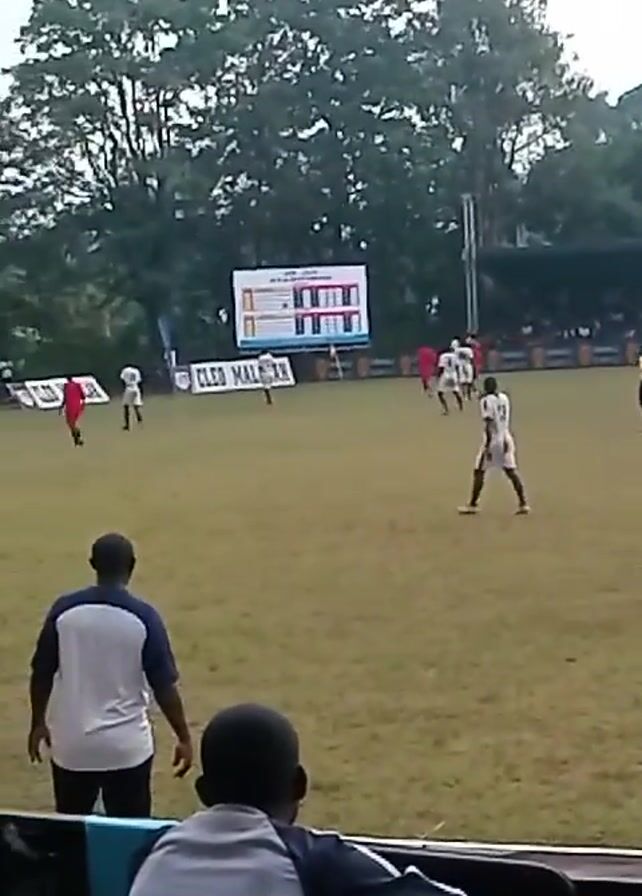 The video captures a soccer game in progress on a grass field, viewed from behind the stands. Several players wearing white uniforms with black numbers are scattered across the field, intermingling with players in red uniforms. The game is being observed by a small crowd in the stands, while an electronic scoreboard displays information about the game. There is a person wearing a white t-shirt with blue sleeves in the foreground, their back is to the camera. Tall trees are visible in the background, framing the scene.