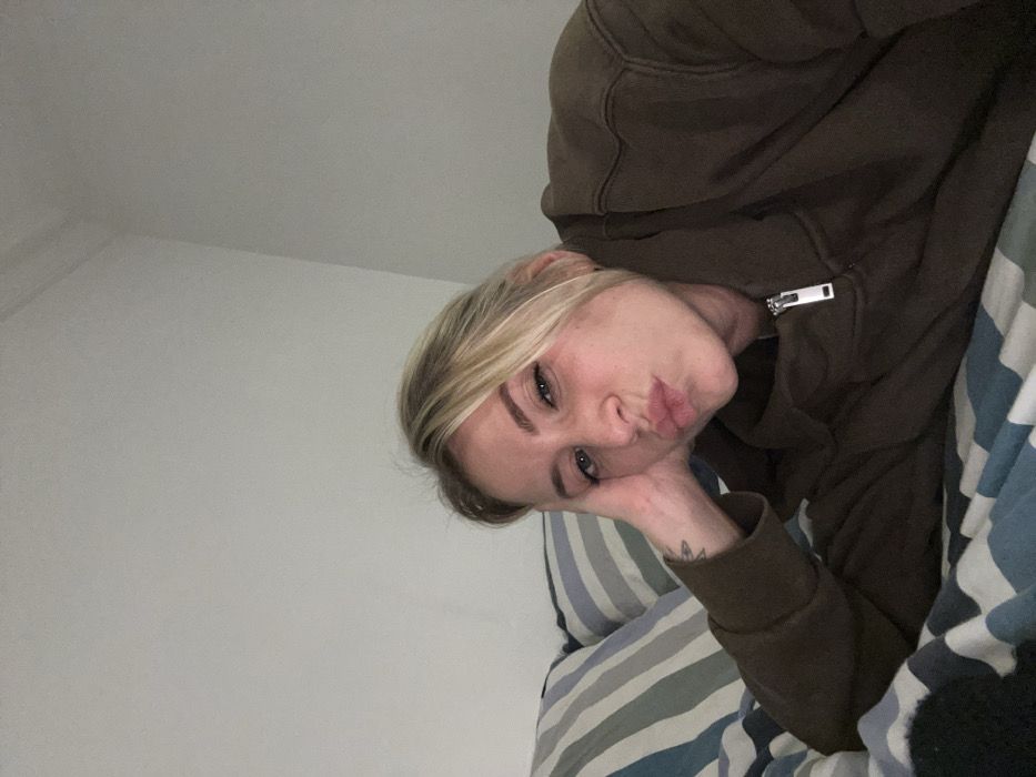 A woman with blonde hair is resting on a bed with striped blue and white bedding. She is wearing a brown hooded sweatshirt. Her head is tilted, resting on her hand, and she is looking at the camera with pursed lips. A wall is visible in the background, and the image is taken from an slightly elevated angle, giving the impression of looking down at the subject.