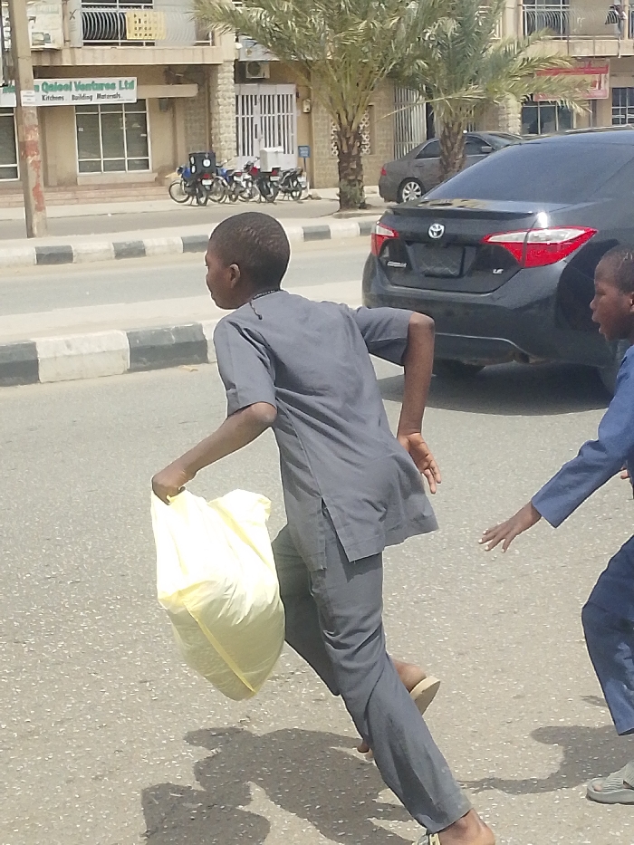 The image depicts a street scene in Gyadi Gyadi Arewa, Nigeria, under bright daylight with strong shadows. Two young males are in motion on an asphalt road. The primary figure, a young male wearing a charcoal grey short-sleeved tunic and matching trousers with light-colored sandals, runs from left to right, carrying a full light-yellow plastic bag in his left hand. His head is turned to the right. To his right, partially visible, a second young male in a blue top and trousers extends his left arm forward with an open hand, reaching towards the first boy. In the background, a black Toyota Corolla sedan is visible on the road. Across a curb with black and white stripes, a light-colored commercial building with a visible sign for 'Qisol Ventures Ltd' stands. Several motorcycles, some fitted with delivery boxes, are parked in front of this building. Two large palm trees are situated between the building and the road.