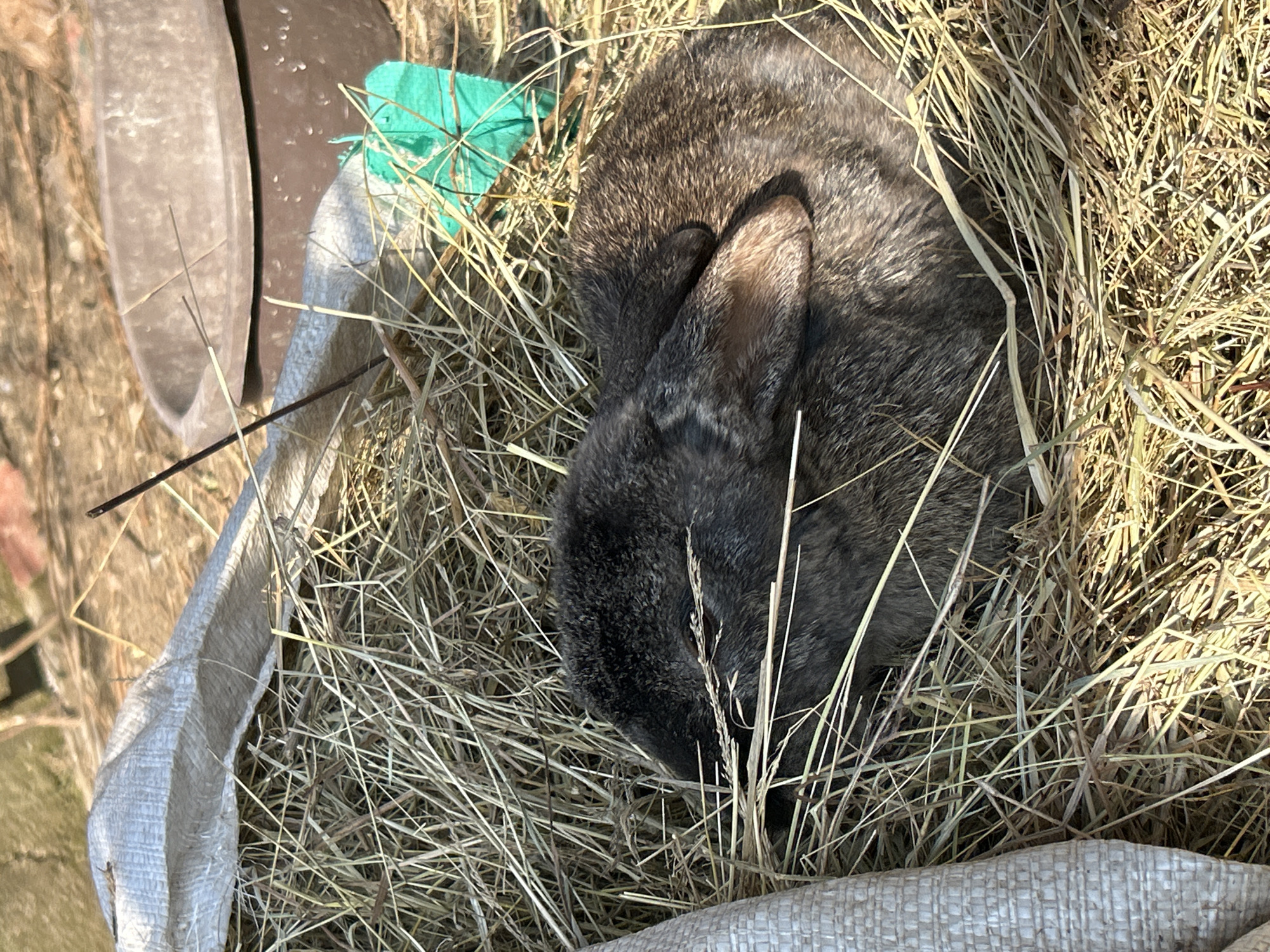 - "A single, dark gray and brown rabbit is observed resting curled up within a bed of dry, yellowish hay" by FM-lGrUH2, licensed under CC BY 4.0