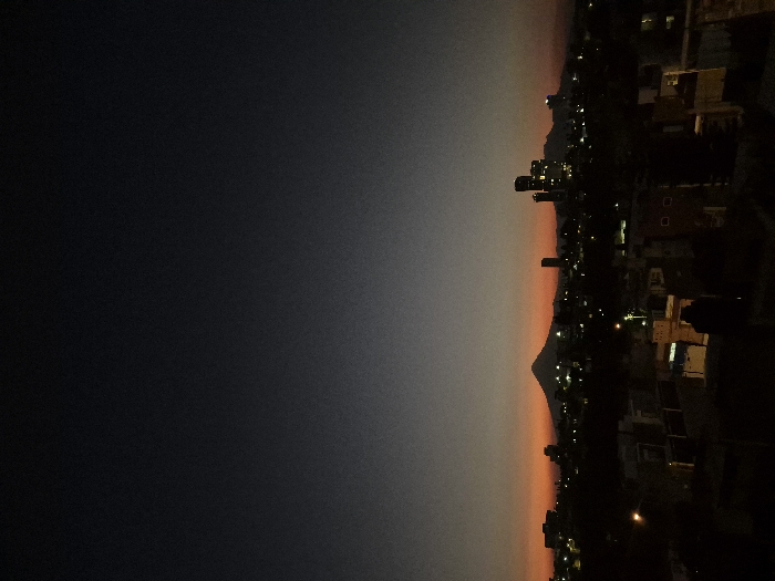 The image presents a wide-angle, elevated view of the city of Puebla, Mexico, during twilight hours, specifically showcasing the Popocatépetl volcano. The upper portion of the frame features a dark sky, transitioning from deep black at the top to a vibrant orange-red glow along the horizon line. Centrally positioned on the horizon, the distinct conical silhouette of the Popocatépetl volcano is visible against the twilight sky, flanked by smaller, indistinct mountainous terrain. Below the horizon, the sprawling urban landscape of Puebla unfolds, characterized by numerous buildings of varying heights. On the right side of the frame, a cluster of modern high-rise buildings is illuminated, their internal lights visible. Throughout the midground, residential and commercial structures are largely silhouetted against the faint ambient light, interspersed with numerous bright points of artificial illumination from streetlights and building windows. The immediate foreground consists of the dark rooftops and partial structures of closer buildings, providing a vantage point over the city. No individuals, explicit actions, or interactions are discernible within the scene.
