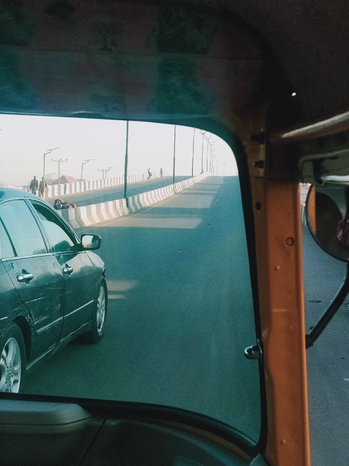 A view from inside a tuk-tuk reveals a road stretching ahead. A dark-colored car with visible scratches is seen to the left. A bridge is in view, lined with streetlights and pedestrian walkways. People are walking on the bridge. The weather appears hazy or foggy. A tuk-tuk's orange frame, including a side mirror, is visible on the right side of the frame.
