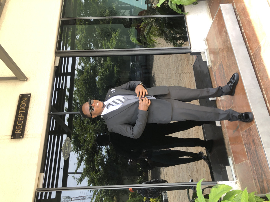 A male individual, approximately 20-40 years old, stands centered in front of a building entrance in Gura Top, Nigeria. He is dressed in a charcoal grey two-piece suit, a light grey waistcoat, a white collared shirt, and a diagonally striped grey and white tie. He wears dark sunglasses, a gold lapel pin, a white pocket square, and black shiny loafers. His hands are positioned near the buttons of his suit jacket, and he is looking slightly to the viewer's right with a faint smile. The building entrance features large, dark, reflective glass doors. Above these doors, a dark rectangular plaque with gold lettering reads "RECEPTION." A smaller, ornate "WELCOME" sign is adhered to the glass directly below the main plaque. The subject stands on a raised platform or step constructed from reddish-brown polished tiles with a metallic edge. Beyond this platform, the ground appears to be paved with interlocking stones. The reflective glass doors show clear reflections of dense green foliage, what appears to be a distant communication tower or utility pole, and partial silhouettes of at least two other individuals. One reflection, behind the main subject, shows a figure resembling a man in a suit. Another reflection to the far left shows a person possibly wearing a patterned or camouflage jacket. Green potted plants are visible to the right of the entrance. The scene is illuminated by natural daylight.