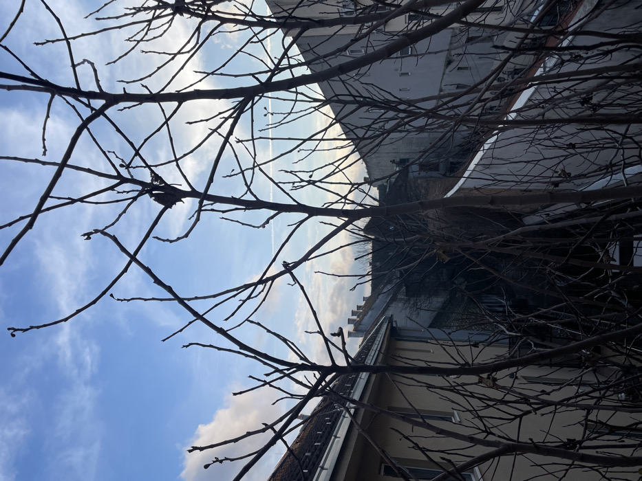 Bare tree branches dominate the frame, silhouetted against a partly cloudy blue sky