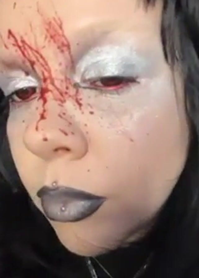 A close-up shot shows a person with pale skin, black hair, and striking makeup