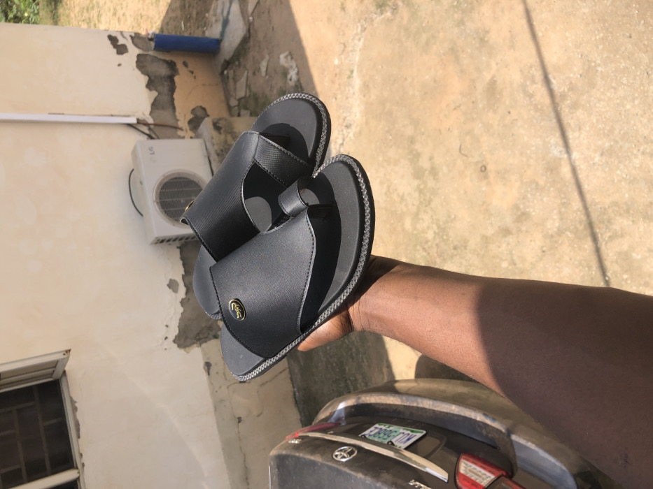 A dark-skinned right arm and hand hold a pair of black, open-toed male sandals aloft