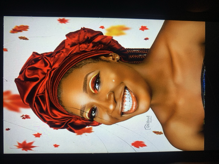 This is a studio portrait of a woman, captured and displayed on a cracked digital screen. The subject is an adult African woman, centrally positioned and smiling broadly with visible white teeth. She wears a voluminous, glossy dark red headwrap (Gele) and her shoulders and upper chest are bare, revealing dark brown skin. Her hair, styled in braids, is partially visible beneath the headwrap on the right side of her head. Her makeup includes prominent yellow, orange, and red eyeshadow, winged eyeliner, and false eyelashes. A small, light-colored dot is affixed to her right cheekbone, and a gold-colored stud earring is in her right ear. The background is white, adorned with scattered red and orange leaf-like motifs. A watermark, "©Alfred Studios," is visible in the lower-left portion of the image, indicating the photograph was taken at Alfred Studios, located in Jos, Nigeria. The image is framed by dark borders, suggesting it is a photograph of a screen, which exhibits multiple diagonal and intersecting cracks, most notably across the left side of the subject's face and the upper-left background.