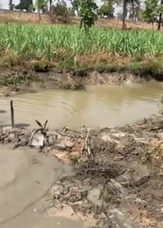 Two men are transferring liquid into a muddy pond. One man is wearing a black shirt and the other is wearing a maroon shirt. The man in black holds a yellow container as he walks through the mud. The other man is helping the first to navigate the muddy water. The pond is in a rural area with sugar cane fields in the background. There are palm trees dotting the landscape.