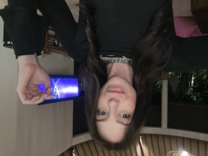 The image depicts a female individual situated within an interior, semi-open architectural structure, indicated as being in Kerobokan Kelod, Indonesia. The subject, possessing dark brown hair and light skin, directly faces the camera with a subtle smile. She is dressed in a black long-sleeved top. An inscription, appearing as Cyrillic script, is observable on her lower neck. Her left hand is raised to chest height, fingers slightly curled, potentially holding a small, indistinct object. The background on the left reveals a dark outdoor area with tropical foliage visible through an opening, adjacent to a structural column and a pink cushion. On the right, a flat-screen television displaying a bright blue-toned image is mounted on a light-colored wall, positioned above a wooden console. The overhead structure features visible wooden beams and a thatched or woven material. Artificial lighting illuminates the scene, suggesting nighttime conditions.