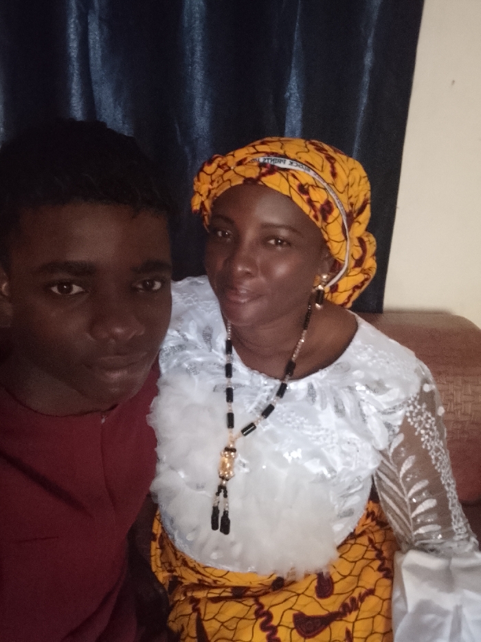 A selfie shows a young man with short black hair in a red shirt next to a woman wearing a yellow headscarf, a white lace top with fluffy trim, and a yellow patterned skirt