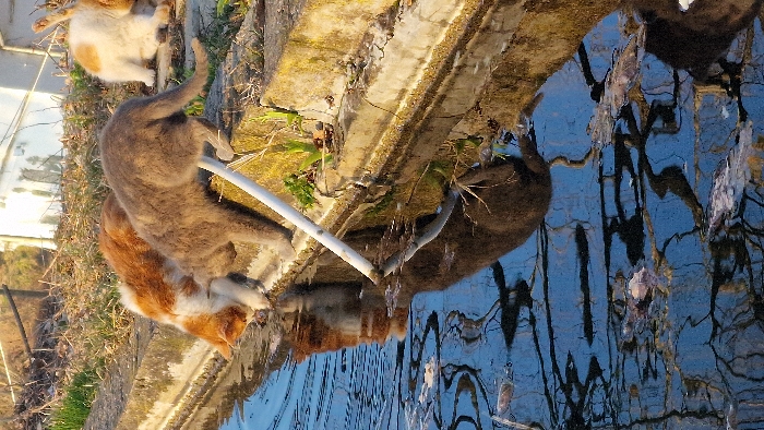 - "The scene depicts three domestic cats near a concrete-lined water channel in Topolovets, Bulgaria, under natural lighting conditions" by FM-KFop22, licensed under CC BY 4.0