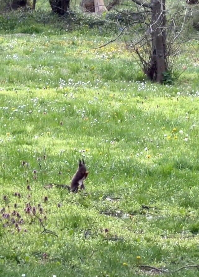 squirrel in a grassy field. The squirrel is sitting upright on its hind legs, holding something in its front paws and eating. The field is green and has small white and yellow flowers. There are also some purple flowers in the foreground. There are trees in the background, with some of them bare. The squirrel appears to be undisturbed and focused on its meal.