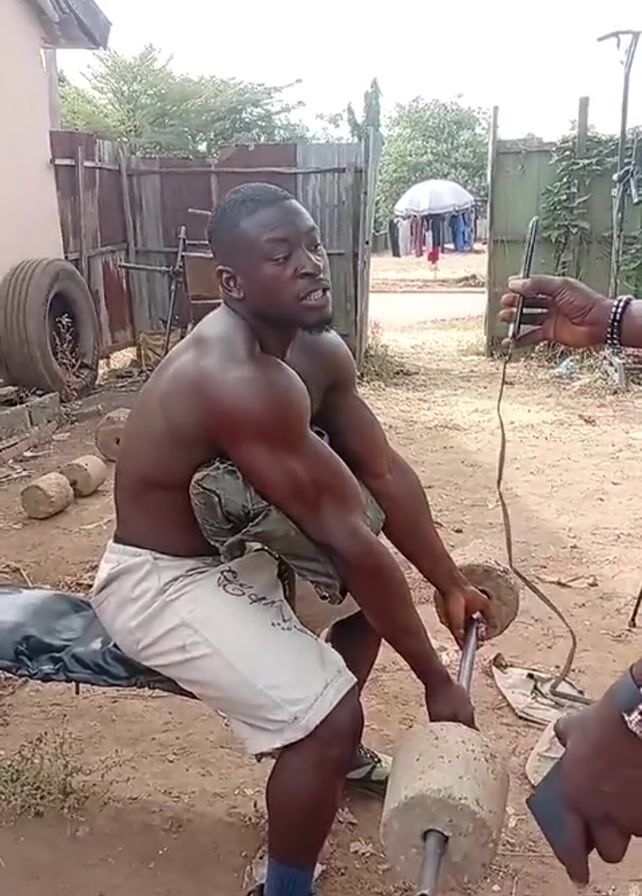 A shirtless, muscular man sits on a weight bench in an outdoor setting and performs a barbell curl exercise. The barbell has what appear to be concrete weights attached. He is wearing light-colored shorts, blue socks, and athletic shoes. Behind him are a house, a tire, a wooden fence, and other equipment. To his right, an individual with a wristwatch on their wrist holds a cell phone, apparently recording him. The ground is dirt and sparse vegetation. A second individual is also partially visible to the right of the frame.