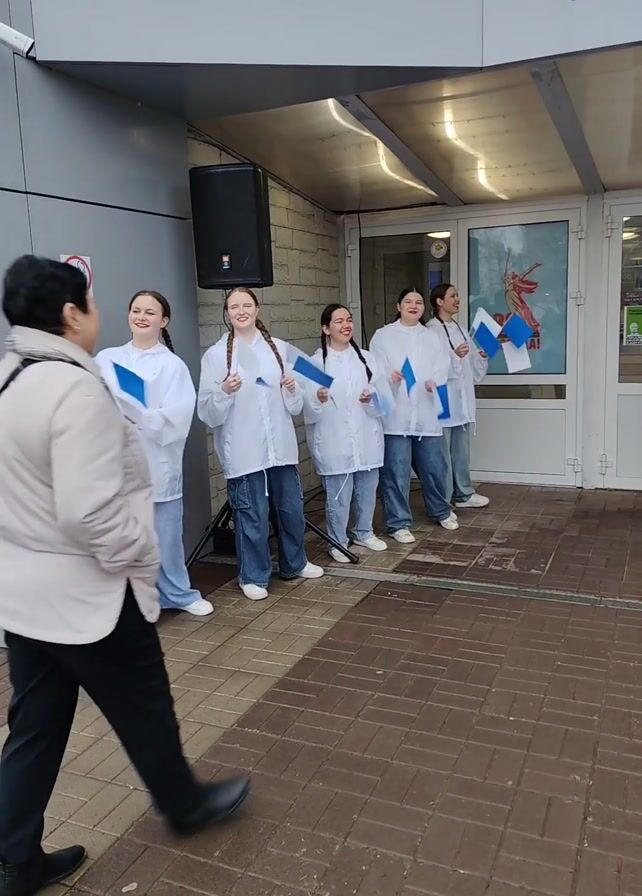 five women in matching outfits standing in front of the entrance to a building. They wear white jackets and light-wash jeans, and each holds a flag with a white upper half and blue lower half. They are positioned in a line, waving the flags and singing. A loudspeaker stands beside the group. A woman in a tan jacket walks in front of the group. The background includes a gray-blue wall with a no-smoking sign, brick paving stones, and a door with a poster.