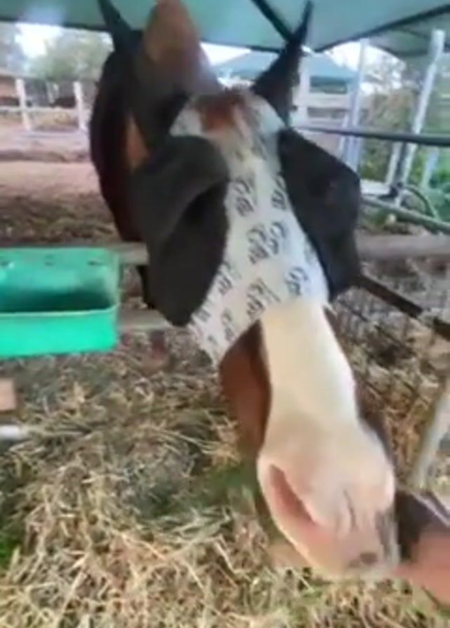 A horse with a white and black eye mask eats grass from a person’s hand