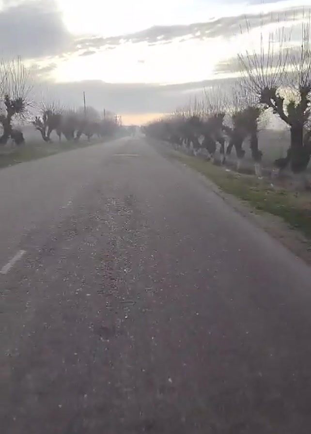 A camera placed on the dashboard of a vehicle records a drive down a long, straight, cracked asphalt road. Bare trees line both sides of the road. The sky is visible above the trees, featuring a mix of white and gray clouds, illuminated by the sun setting on the horizon. There's fog in the distance. The sound of music can be heard.