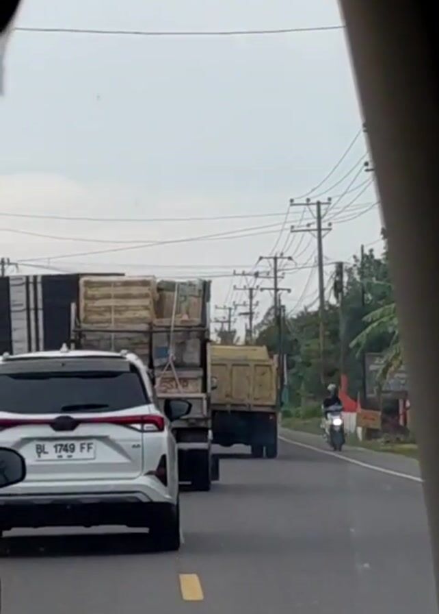 A recording taken from inside a vehicle shows the back of a white car, a large truck carrying crates, and another yellow truck in front of it. A person on a scooter is seen driving on the right side of the road. The vehicles are on a road with a double yellow line dividing the lanes. Power lines are visible overhead. The sky is overcast. The side frame of the recording vehicle is visible in the right edge of the video.