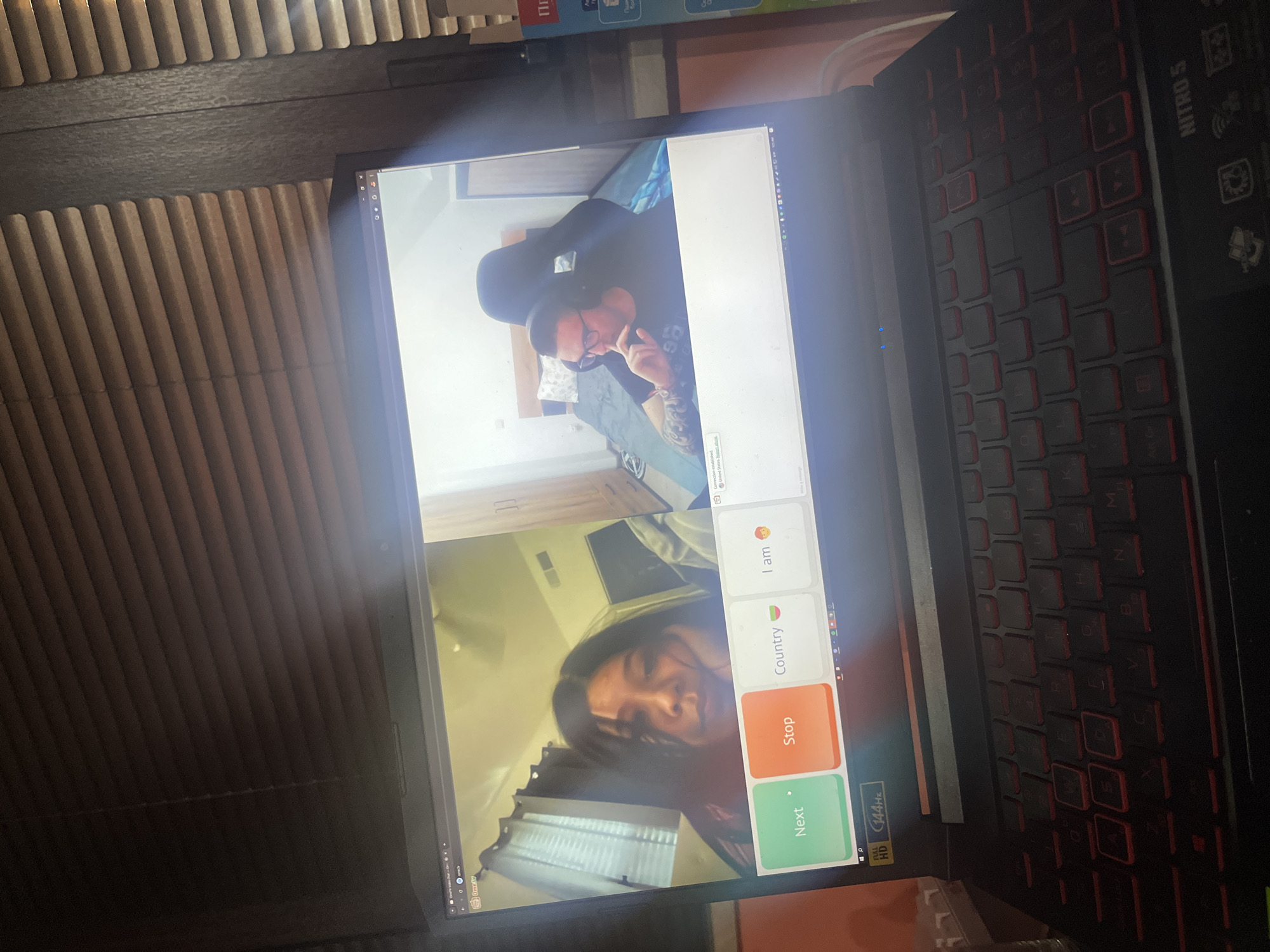 The image displays a dark-toned interior scene focused on an open black Acer Nitro 5 laptop with a red-backlit keyboard. The laptop screen shows an active Omegle video chat interface. On the left panel of the video chat, a female individual with dark hair and a somber expression rests her head on her left hand, looking forward. Her background includes a window with light-colored curtains and a ceiling fan. On the right panel, a male individual wearing glasses and headphones is visible. He has short hair, a beard, and tattoos on his left forearm. He is seated in a black gaming chair and appears to be touching his chin with his left hand. His background shows a sparse bedroom with light walls, a bed with a blue duvet, and a closed door. The Omegle interface elements below the video panels include "Next," "Stop," "Country," and "I am" buttons, along with a partial display of "Connection established. United States." indicating the remote user's location. The laptop screen also displays "FULL HD" and "144Hz" icons. The immediate environment around the laptop includes dark brown horizontal blinds in the background, which are partially obscured on the right by a light blue and white product box, marked with Cyrillic text and "PREMIUM." A blurry, light-colored object, possibly a bottle or glass, is situated to the left of the laptop. The specific location within Sofia, Bulgaria, cannot be determined from the visual information presented in the image.