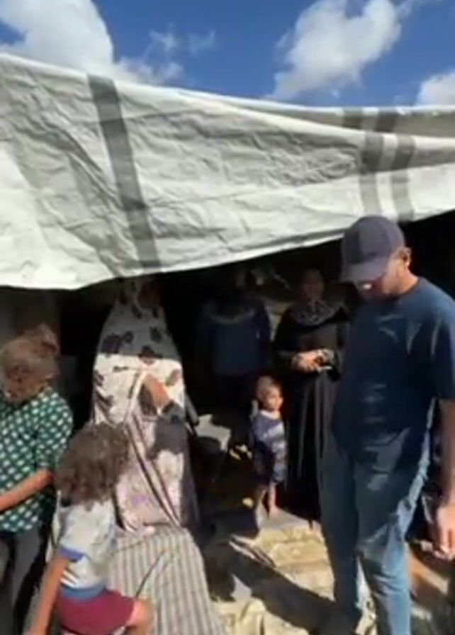 A group of people, including adults and children, are standing under a makeshift shelter constructed from a tarp or sheet. The shelter appears to be located outdoors under a clear blue sky with scattered clouds. The adults are dressed in traditional clothing, while the children are wearing more casual attire. One of the children is a young boy with curly hair, wearing a t-shirt and shorts. A man in a blue shirt and baseball cap stands outside the shelter, facing the group. The shelter is covered with a patterned rug. There appears to be a chair inside the shelter as well. The people inside the shelter are looking out towards the man, and there's a sense of interaction or communication occurring between the group and the individual standing outside.