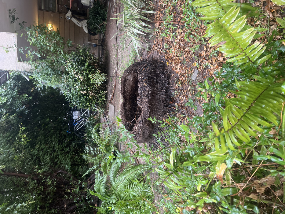 The image depicts an overgrown outdoor residential space, likely a private garden or courtyard, within the city of Tel Aviv, Israel. In the center of the frame, a dark brown, fibrous, hollowed-out tree stump, appearing to be the base of a removed palm tree, is prominently situated on exposed reddish-brown soil. The stump has a roughly circular shape with a jagged, open top, suggesting decomposition or removal. The ground immediately around the stump is covered with scattered brown, dried leaves. The foreground is populated by dense, bright green vegetation, primarily ferns with glossy, wet-looking fronds, along with other leafy shrubs. In the left background, several bicycles are visible, leaning against a tall, dense wall of dark green foliage, possibly a hedge or trees. One bicycle features a light-colored bag on its rear rack. To the right background, a segment of a light-colored building facade, consistent with residential architecture, is visible. A wall-mounted light fixture is present on the building. A cream-colored scooter is parked on a paved area near the building, partially obscured by a substantial green bush. Another plant with variegated green and white leaves is situated on the right side of the central stump. The ground throughout the scene is a mix of soil, scattered leaves, and patches of green growth. Small sections of light-colored paving stones or concrete are intermittently visible. No individuals are present in the scene. The overall lighting suggests daylight, possibly overcast or within a shaded area. While consistent with a residential setting in Tel Aviv, Israel, the specific address or neighborhood cannot be ascertained from the visual evidence.