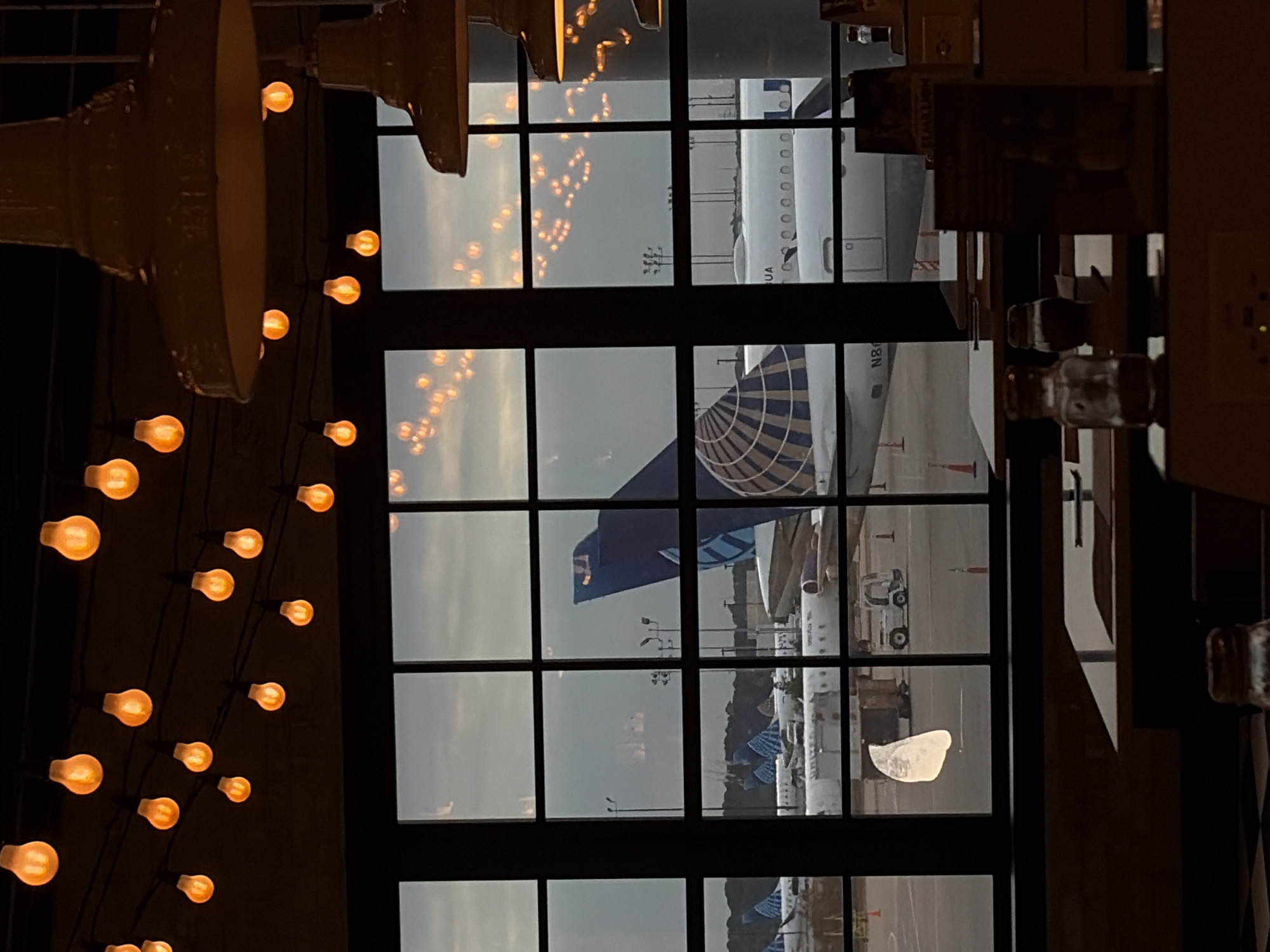 From inside a building in Houston, United States of America, a view through a multi-paned window reveals parked airplanes on an airport tarmac. To the left, a string of lit bulbs is visible. The interior of the building is dimly lit, with blurred objects adding to the atmosphere. The outside environment appears overcast.