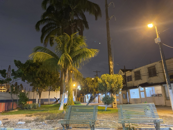 A nighttime park scene shows two green benches facing a small garden with tropical trees. In the background are buildings and a tall utility pole. The park is lit by streetlights that cast a yellow glow. The sky is a dark blue, suggesting dusk or night. A wall runs along the back of the park area.