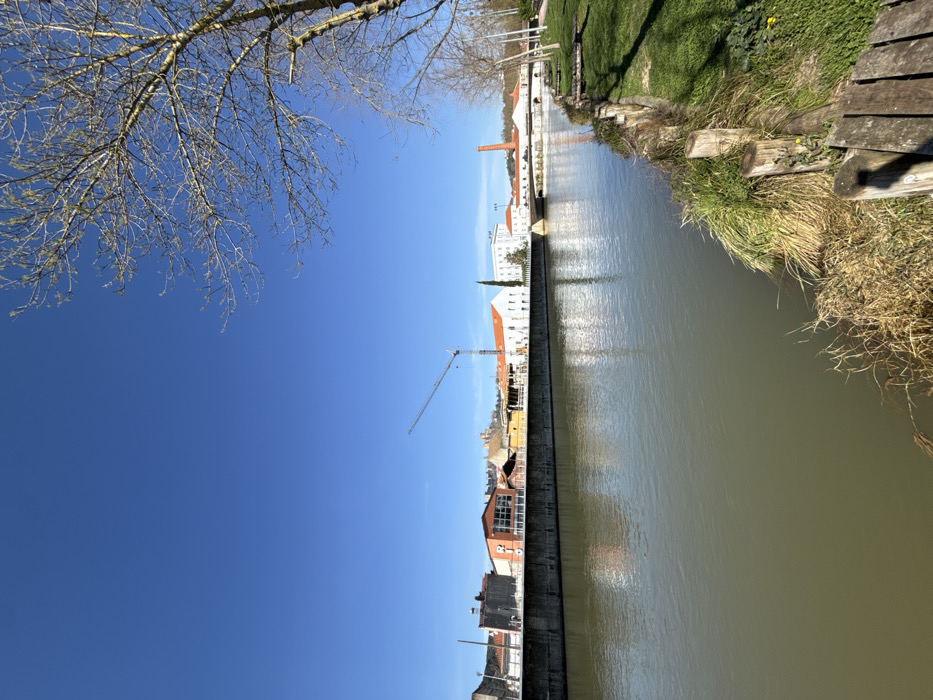 The image depicts a panoramic view of the Nabão River in Tomar, Portugal, under a clear, bright blue sky. The river occupies the lower half of the frame, flowing from the foreground towards the background, exhibiting calm, murky greenish-brown water with subtle reflections. On the right side of the foreground, a grassy bank slopes gently towards the river, bordered by a rustic retaining wall constructed from vertical wooden posts and horizontal planks. Patches of green and dry, yellowish grass are visible on this bank. A large, deciduous tree with bare branches and nascent buds partially extends into the upper right corner of the frame. Further along the right bank, smaller, leafless trees are visible, and a grassy path extends into the distance. The opposite bank of the river features a prominent, dark-colored concrete retaining wall. Above this wall, a row of buildings lines the river. Notable structures include a reddish-orange building with a partially visible "RIO" sign on its facade, and several other multi-story buildings of varying colors including white, grey, and light yellow. Some structures appear to be undergoing construction or renovation, with exposed framing visible. A tall, red and white construction crane is positioned above these buildings in the mid-ground. In the further distance, an industrial-style building with a reddish-brown brick chimney stands out, and a white, arched bridge spans the river connecting both banks. On the elevated horizon behind the buildings, a distinct historic stone structure, likely a castle or convent, is visible. No individuals or animals are present within the scene. The overall lighting suggests mid-day conditions.