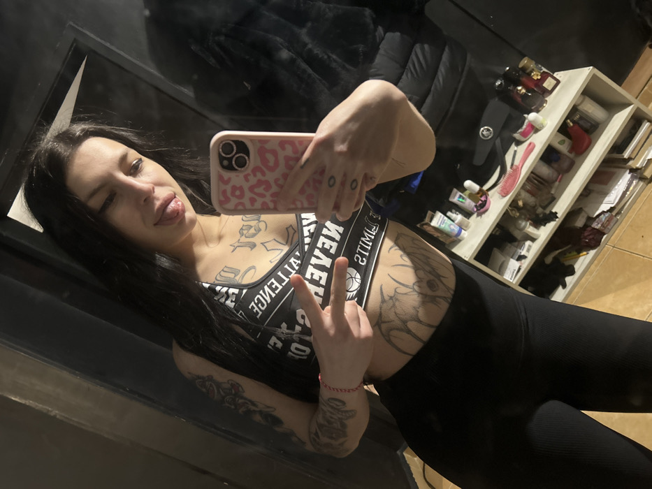 The image depicts a female subject captured in a mirror selfie, located in Ravda, Bulgaria. The subject has long, dark hair and extensive tattoos visible on her upper chest, both forearms, biceps, and abdomen. She wears a black and white sports bra with reversed text ("NEVER GIVE UP," "NO LIMITS," "ALLIANCE") and black ribbed leggings. Her left hand is raised, forming a "peace" sign, and her tongue is extended. She holds a smartphone with a pink leopard-print case in her right hand, positioned to reflect the device's multiple camera lenses. Small ring tattoos are present on her fingers. The background features a white, multi-shelf unit to the right, displaying various items including toiletries, bottles, and a pink hairbrush. The floor is tiled with light brown or beige square tiles, and the walls appear to be dark, possibly black or dark grey. A reflection of a dark, possibly quilted jacket or fabric is visible on the right side of the mirror.