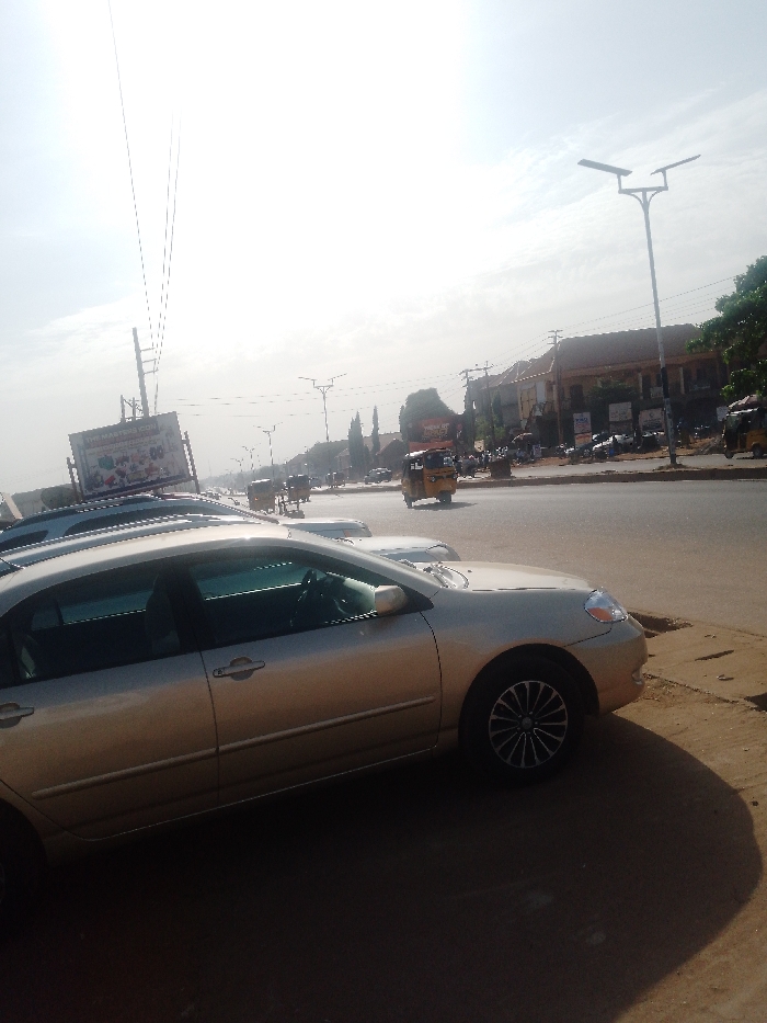 This image depicts a street scene in Sabon Tasha, Nigeria, under bright, hazy daylight