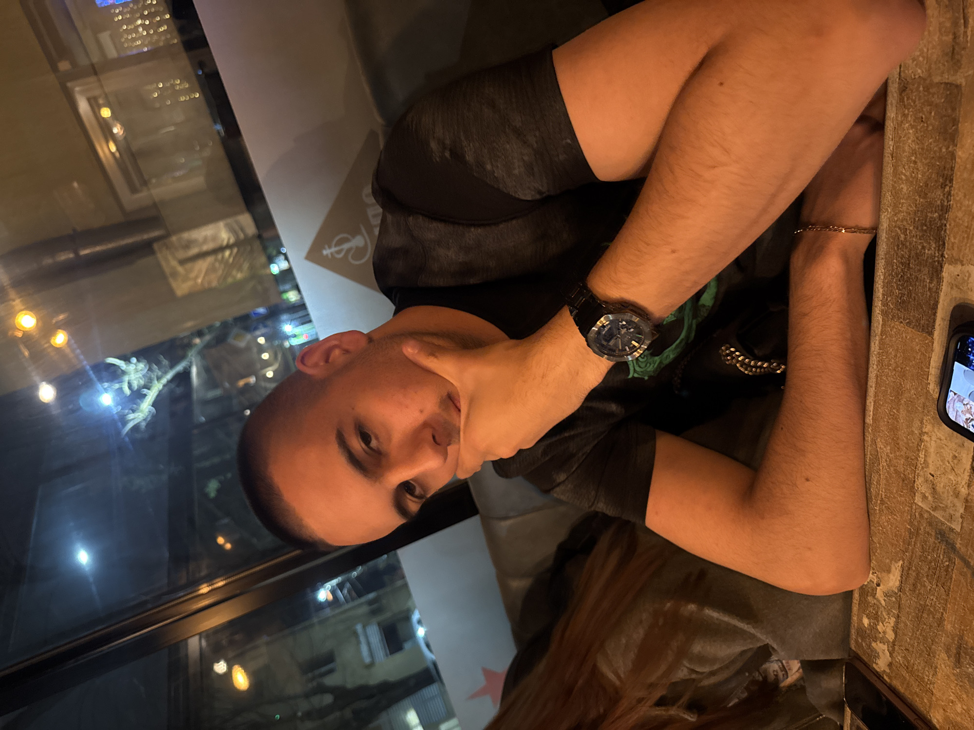 A person is sitting at a table in an indoor setting. The person is wearing a dark-colored t-shirt and a wristwatch. The person's right hand is touching their face. Part of a dark handbag with a gold chain is visible. A gold bracelet is on the person's right wrist. Part of a smartphone is on the table. A window is in the background, with lights suggesting a city scene at night. The location appears to be Pernik, Bulgaria.