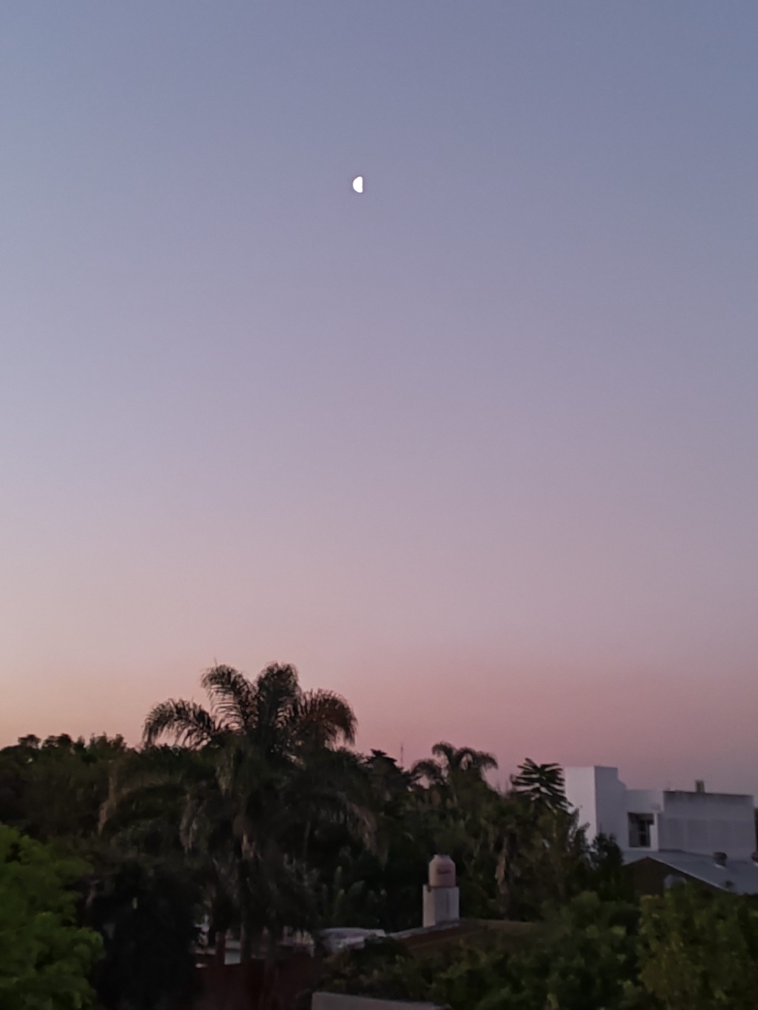 The image depicts an elevated view of an urban or suburban landscape at twilight in La Plata, Argentina. The sky, occupying approximately two-thirds of the frame, transitions in color from a light purplish-blue at the top to a pale rose-pink near the horizon. A white, right-facing crescent moon is visible in the upper center-left quadrant of the sky. The lower third of the scene is dominated by dense, dark green foliage, indicating numerous trees. A prominent, large palm tree is situated within this foliage towards the center. Visible structures include a light-colored cylindrical water tank on a rooftop on the left, partially obscured by trees, and a modern white building with angular features and a flat roof on the right, also partially hidden by vegetation. Adjacent to the white building, another structure with a gray, sloped roof is present. No individuals, animals, or explicit actions are observed within the frame.