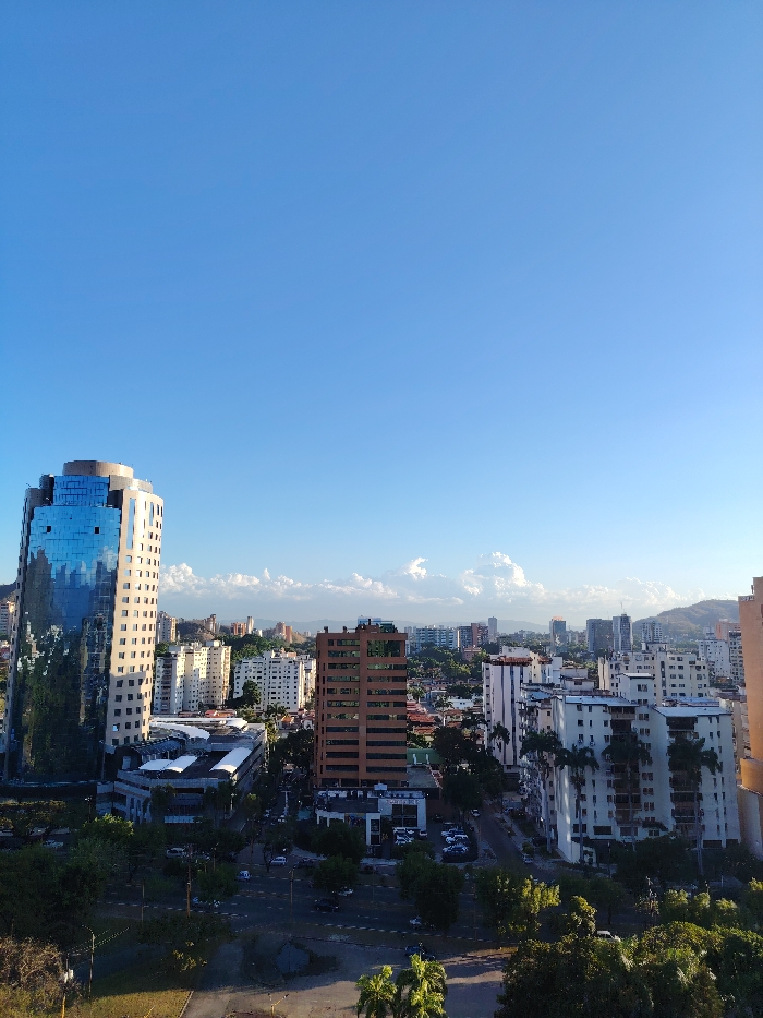 An urban scene unfolds beneath a clear blue sky. A tall, reflective building with a cylindrical top dominates the left. Other buildings, varying in height and style, fill the cityscape. Some are light-colored with balconies, while others are brown. Green trees are interspersed among the buildings and along the streets, adding splashes of nature to the urban landscape. Distant hills form a subtle backdrop to the city.