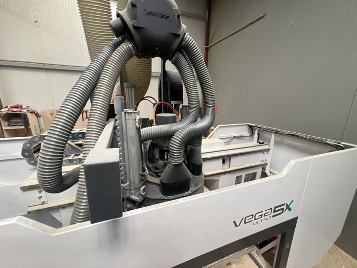 A large industrial CNC machine, an AES 'vegaSX ULTRA 3' model, is prominently featured within a manufacturing facility in Dunavtsi, Bulgaria