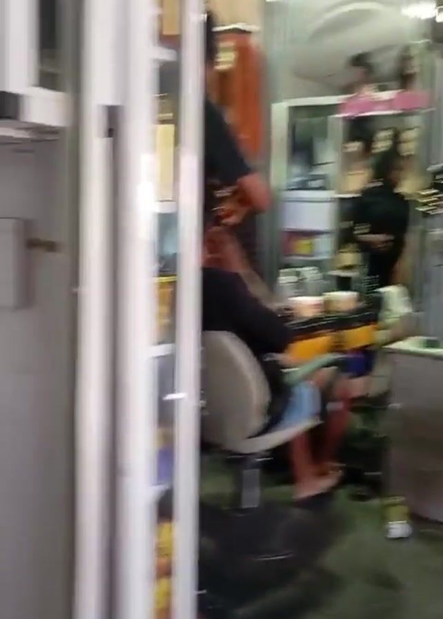 interior of what appears to be a hair salon. There are salon chairs, mirrors, and hair dryers. A person is visible in one of the chairs, and another person is walking through the room using a mobile phone. The walls are gray with white vertical stripes. There's a painting in the background.