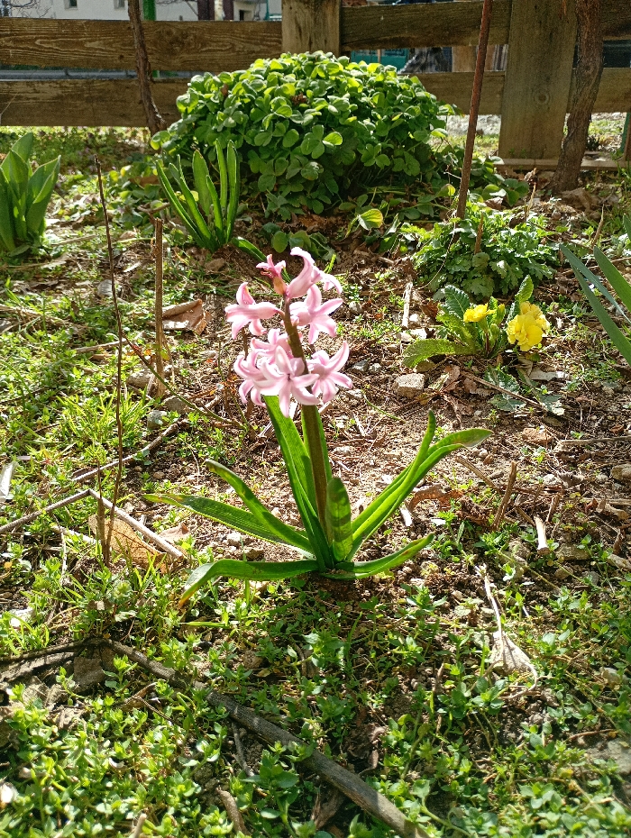 The image displays an outdoor garden scene in Blagoevgrad, Bulgaria, under natural daylight. A single pink hyacinth plant is positioned centrally, exhibiting multiple fully open, light pink florets on an upright green stem with broad basal leaves. The ground surrounding the hyacinth consists of bare soil patches, scattered dry leaves, small green groundcover vegetation, and several small branches or twigs. To the immediate right and slightly behind the hyacinth, a cluster of yellow primroses is visible. Further back, a dense growth of green-leaved plants forms a bush-like mass. In the upper background, a weathered wooden fence, composed of horizontal planks and vertical posts, extends across the frame. Behind the fence, faint outlines of urban structures are discernible. No human subjects or discernible actions are present.