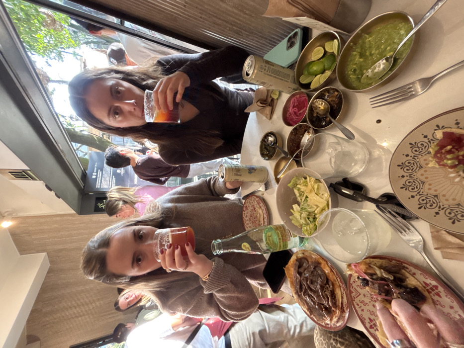 Two women are seated at a table laden with food and beverages. The table is covered with plates of food, including tacos, guacamole, limes, and salads. They are drinking from glasses and cans. The setting appears to be a restaurant or eatery, with other people visible in the background.