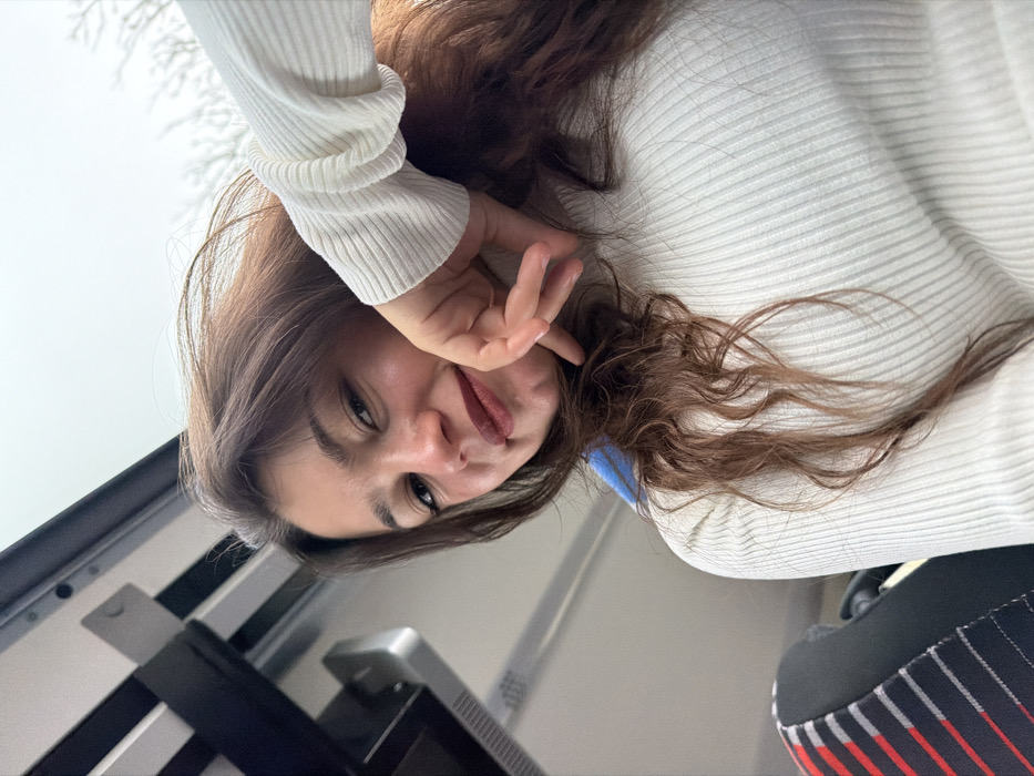A young adult female is depicted in a close-up, low-angle portrait, situated within the interior of a vehicle in Obermodern-Zutzendorf, France. She has long, wavy, dark brown hair and is wearing a light-colored, possibly off-white or cream, ribbed turtleneck sweater. Her left hand is positioned with fingers curled, resting against her jawline. She looks directly towards the camera with a slight smile and wears dark red lipstick. In the lower-left foreground, a portion of a vehicle seat with a black and red striped pattern is visible. The upper background reveals the light-colored ceiling and structural components of the vehicle's interior, possibly including a mounted screen or panel. Beyond the vehicle's window on the right, bare tree branches are visible against an overcast sky.