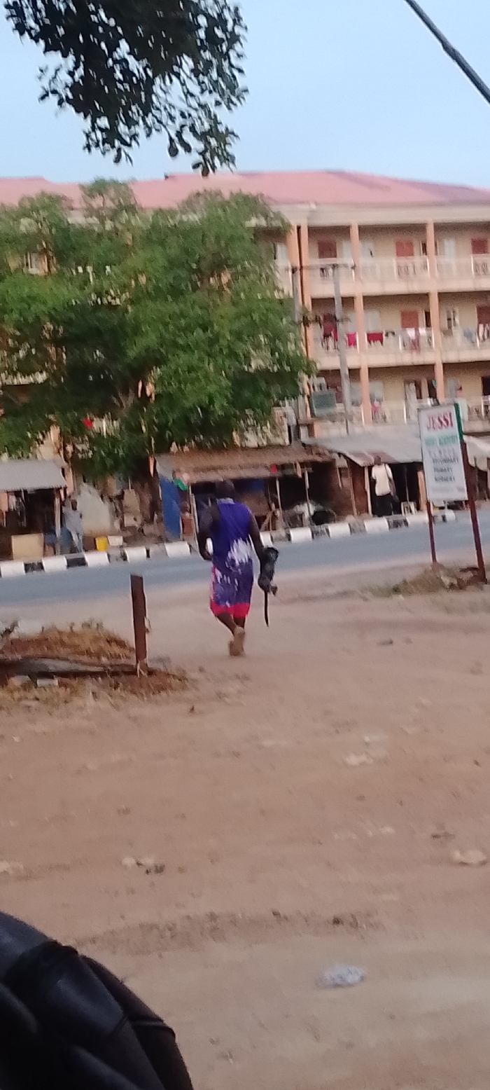 The scene depicts an outdoor urban environment in Adankolo, Nigeria, under a pale sky, possibly during twilight hours. In the foreground, a dirt ground occupies the lower half of the image, with a dark, curved object partially visible in the bottom left corner and a brown wooden post upright in the lower mid-right. A paved road with a distinct white and black striped curb or median crosses the midground horizontally. A lone individual walks away from the camera, positioned slightly right of center on the dirt path adjacent to the road. This person wears a blue garment with white and purple patterns and light brown footwear. They are carrying a dark object in their left hand, which includes a prominent blade resembling a machete. Across the road, a series of small, single-story structures with corrugated metal roofs line the street, suggestive of market stalls or small shops. Other blurred figures of individuals are faintly visible near these structures. Further in the background, a large, multi-story building with a reddish-brown roof and numerous balconies dominates the skyline, with laundry hanging from some balconies. Green foliage from trees partially obscures this building and the shops. To the right of the road, a vertical sign with the word "JESSI" clearly legible at the top, along with other unreadable text, stands near the shops.