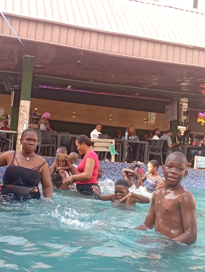 A group of people, including children, are enjoying a sunny day in a swimming pool. A woman in a black top stands in the water, while another woman in a pink top assists children. A boy is prominently featured in the foreground. Behind the pool, an open-air establishment has people seated at tables, suggesting a bar or restaurant setting with visible decorations. The overall scene is lively, capturing a moment of leisure and social interaction.