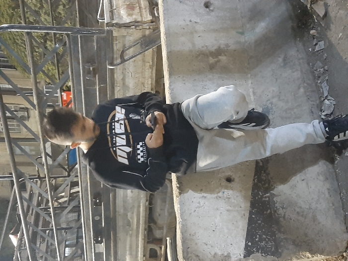 A person in a black sweatshirt with a large graphic design, light gray sweatpants, and black sneakers sits on a concrete structure. They are angled to the right, looking down at a mobile device held in their hands. Metal barriers are visible in the background to the left, along with buildings. The surrounding area appears to be an urban environment, possibly a construction site or public space.