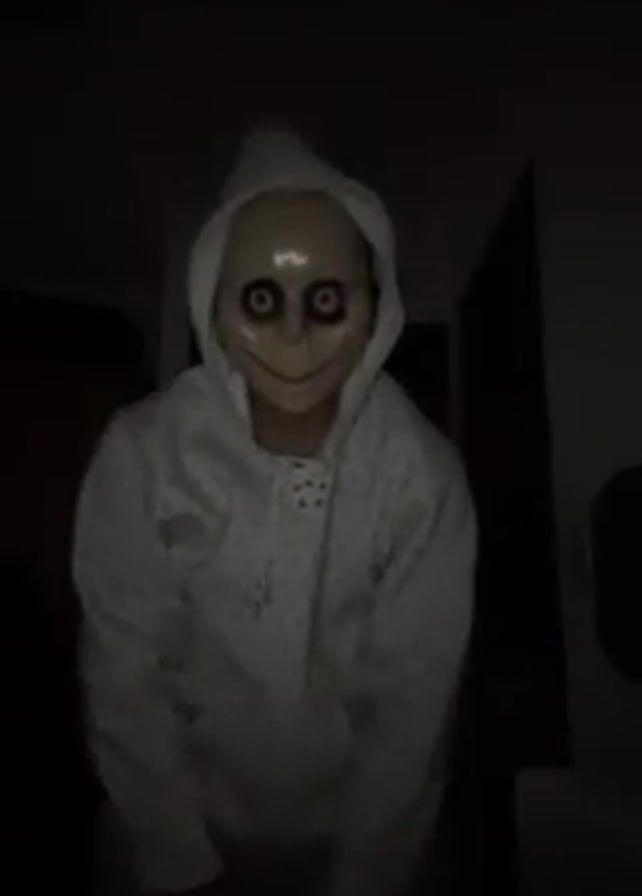 person wearing a white hoodie and a creepy mask in a dimly lit room. The person sways to music that is playing. The mask has a pale face, large black eyes, and a wide smile. A partially visible door is behind the person.