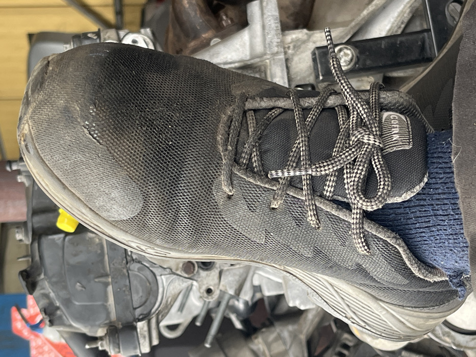 An individual's foot, wearing a dirty, dark grey mesh-material shoe with a visible "Nike" swoosh logo and a "COFRA" brand tag, is depicted in an indoor industrial setting